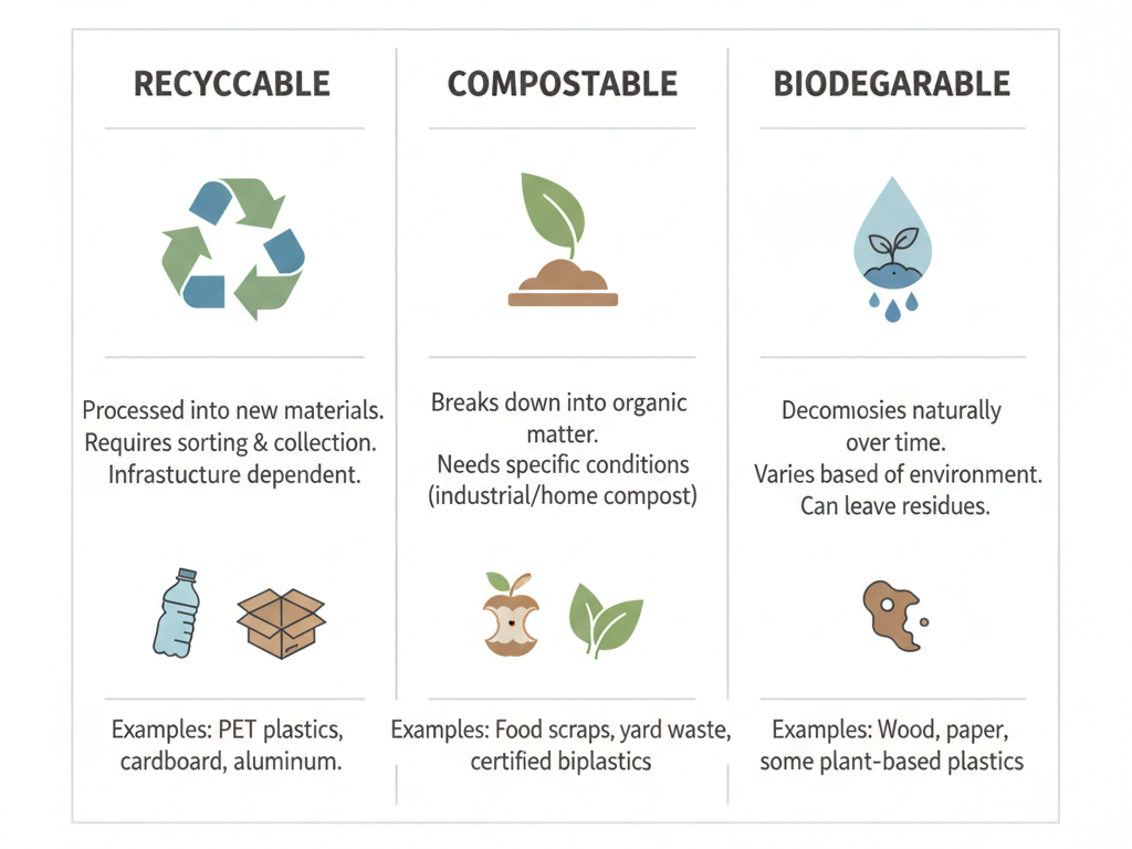 A package is meaningfully recyclable only if collection, sorting, and reprocessing exist where you sell. Designs that simplify materials and components usually perform better in real systems.